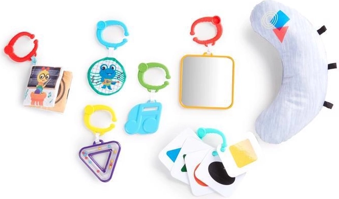 Različite teksture, zveckalice, sigurno ogledalce i viseći elementi potiču znatiželju, vid, sluh i dodir te podržavaju koordinaciju oko–ruka.