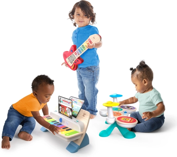 Djeca mogu otkrivati zvukove, slagati riffove, dodavati jednostavne efekte i “jammati” s obitelji. 10 omiljenih melodija i 4 načina igre razvijaju ritam, sluh i koordinaciju. Drveni dizajn bez mehaničkih tipki lako se održava, a zahvaljujući kontroli glasnoće u igri će uživati i roditelji.