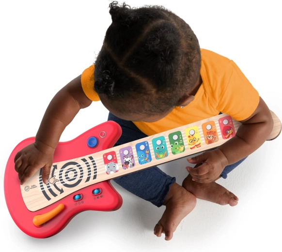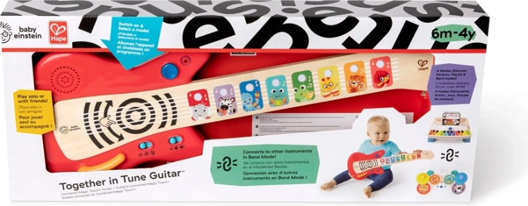 Podržite ljubav prema glazbi već od najranije dobi. Drvena gitara BABY EINSTEIN Together in Tune spaja izdržljivost klasične igračke s modernom tehnologijom Magic Touch – dovoljan je lagan dodir obojenih pragova i zazvučit će autentični gitarski tonovi. U načinu rada benda dodatno se bežično povezuje s ostalim instrumentima iz serije i automatski se harmonizira.