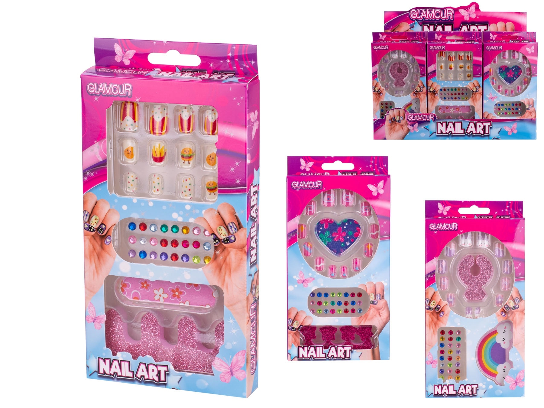 Set je dostupan u tri razigrana dizajna – s motivima hrane, srca i duge. Zahvaljujući jednostavnoj primjeni bez laka, djeca mogu sigurno isprobavati različite stilove i razvijati svoju maštu. Kompaktno pakiranje lako se sprema i nosi, što ga čini idealnim za putovanja, posjete i dječje zabave.