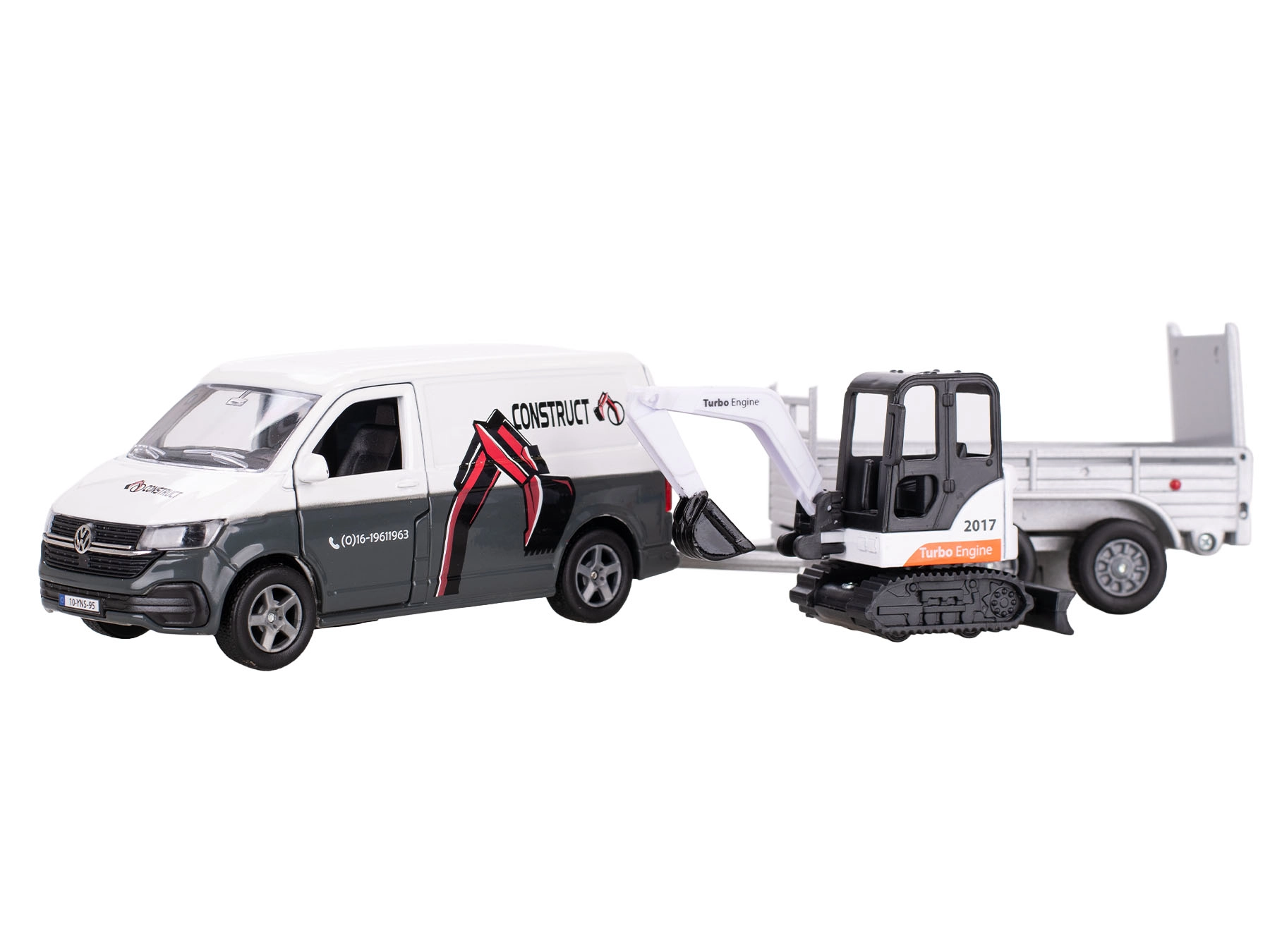 - Realističan set: VW Transporter, odvojiva prikolica i funkcionalni mini bager