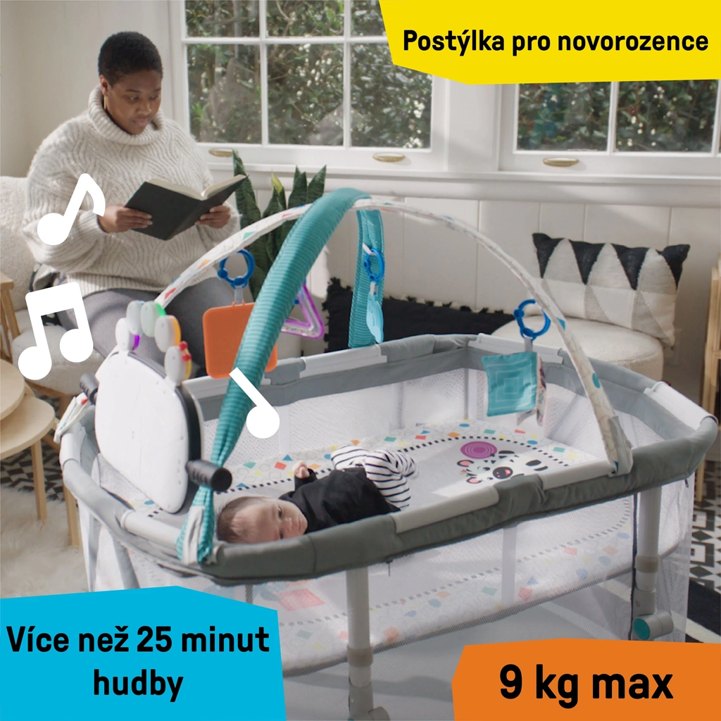 Interaktivni klavir nudi više od 70 melodija i fraza na 4 jezika te preko 25 minuta melodija i svjetlosnih efekata u načinu Melody. Prozračne mrežaste stijenke osiguravaju izvrsnu vidljivost i protok zraka, perivi madrac/plahta olakšava održavanje, a zahvaljujući brzom trokoraknom sklapanju i priloženoj putnoj torbi prijenos i pohrana su trenutačni.