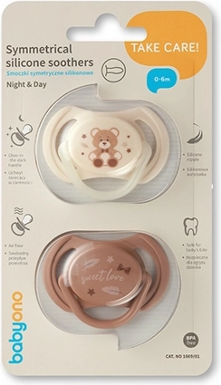 BabyOno dude dizajnirane su tako da poštuju prirodne potrebe bebe i preporuke stručnjaka. Simetričan spljošteni vrh lako se prilagođava djetetovim ustima te podržava pravilan položaj jezika i razvoj zubnog niza. Lagani, ergonomski štitnik s ventilacijom osigurava protok zraka i minimalizira iritacije.