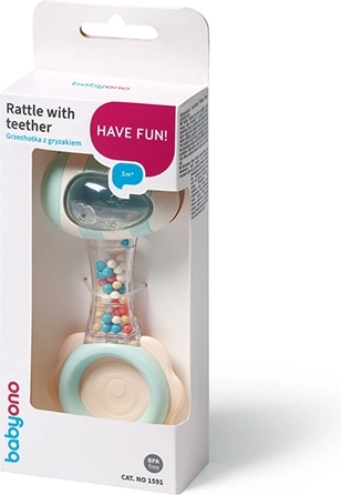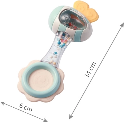 Sigurni materijali ugodni na dodir i promišljen oblik jamče udobno držanje čak i za one najmlađe. Prozirni dio s obojenim perlicama stvara smirujući zvuk koji privlači pažnju i potiče slušnu percepciju. Silikonska grickalica nježno masira desni i pomaže pri nelagodi tijekom rasta zubića.