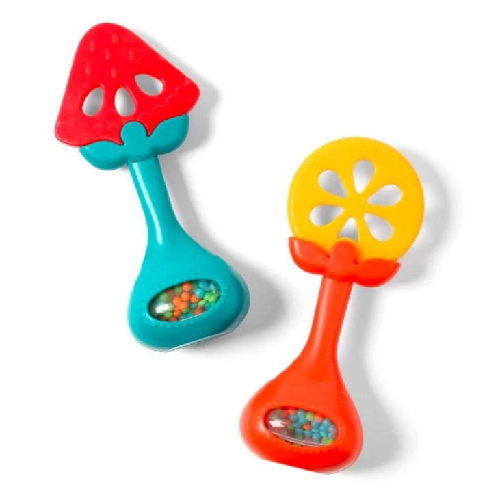 Edukativna grickalica sa zvečkom u obliku naranče dizajnirana je za ugodnu i sigurnu uporabu kod najmlađe djece. Teksturirane zone pomažu ublažiti svrbež i pritisak pri rastu prvih zubića, dok zvečeće kuglice donose zabavu i slušnu stimulaciju. Lagana konstrukcija i lako prihvatljiva drška podupiru koordinaciju oko–ruka i prebacivanje iz jedne ruke u drugu.