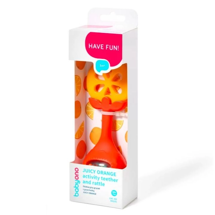 Multifunkcionalna grickalica i zvečkom u obliku naranče od BabyOno donosi olakšanje tijekom nicanja zubića i istovremeno potiče razvoj osjetila. Zahvaljujući mekanom elastičnom materijalu s teksturiranom površinom nježno masira desni, dok je lagana i ergonomska drška idealna za male ručice. Unutra skrivene perlice ugodno zveckaju, potiču igru i vježbaju hvat.
