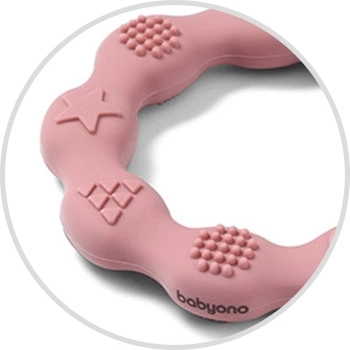 Ružičasta silikonska grickalica BabyOno u obliku prstena donosi bebi trenutno olakšanje pri nicanju zubića. Zahvaljujući mekom i elastičnom silikonu, raznolikim teksturama i mogućnosti hlađenja u hladnjaku nježno masira desni, stimulira osjetila i lako se drži i u malim ručicama. BPA free, prikladno od 0m+.