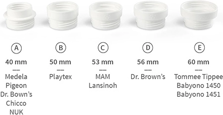 Dio pakiranja je pet izmjenjivih adaptera (40–60 mm) za marke kao što su Medela, Chicco, NUK, Dr. Brown’s, Pigeon, Playtex, MAM, Lansinoh, Tommee Tippee i druge. Bočice od 43 mm (Avent, BabyOno 402/403) bez adaptera.