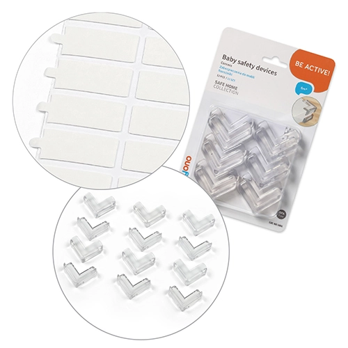 Praktične kutne kapice štite djecu i odrasle od udaraca u oštre rubove stolova, ormarića i komoda. Prozirni, omekšani materijal je netoksičan, izdržljiv i dizajniran tako da ne narušava izgled namještaja. Zahvaljujući L-obliku, zaštite se mogu, ovisno o debljini ruba, postaviti i s obje strane kuta.