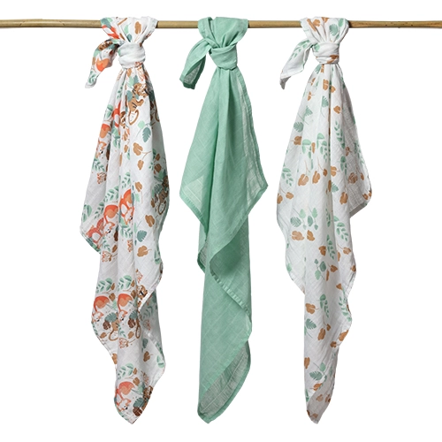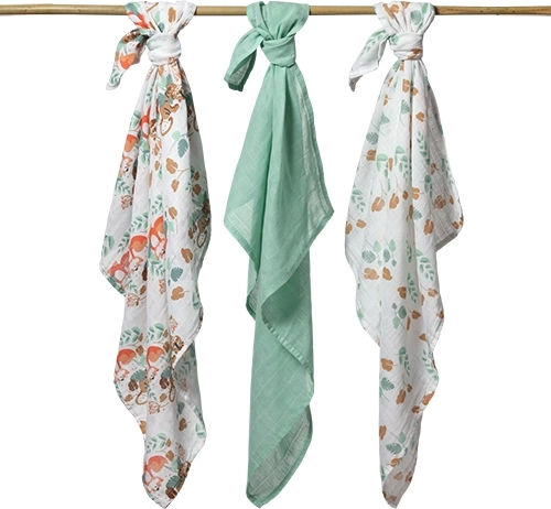 Svestranu primjenu cijenit ćete kod kuće i na putu: kao pelenu, ručnik, laganu dekicu, podbradak, podlogu ili sjenilo za kolica. Set sadrži tri komada u usklađenim dizajnima – dvije s prirodnim printom i jednu jednobojnu mint, kako bi se uklopile u opremu i uvijek bile pri ruci.