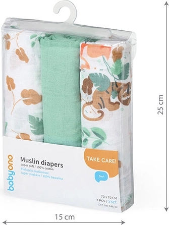 Praktičan set triju mušlinskih pelena od 100% pamuka za svakodnevnu njegu bebe. Pelene su iznimno mekane, prozračne i nježne prema osjetljivoj koži. Zahvaljujući univerzalnoj veličini 70 × 70 cm poslužit će za presvlačenje, brisanje, kao pokrivalo pri dojenju, plahte ili lagani ručnik. Stilska izvedba u mint boji s nježnim printovima odlično će upotpuniti opremu za bebu.