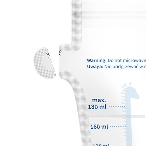 Praktični izljev pojednostavljuje precizno i čisto prelijevanje mlijeka u bočicu. Na prednjoj strani nalazi se jasna skala do 180 ml i polje za opis za datum i vrijeme izdajanja. Vrećice su sterilizirane gama zračenjem, što osigurava visoku razinu higijene za vašu bebu.