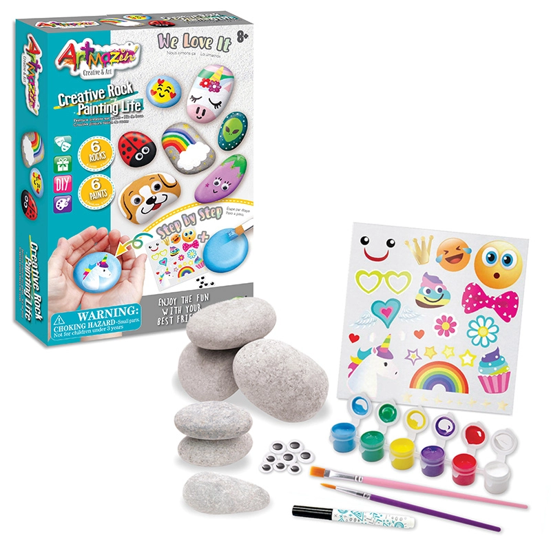 - Kompletan set: 6 kamenčića, 6 akvarelnih boja, 2 kista, naljepnice