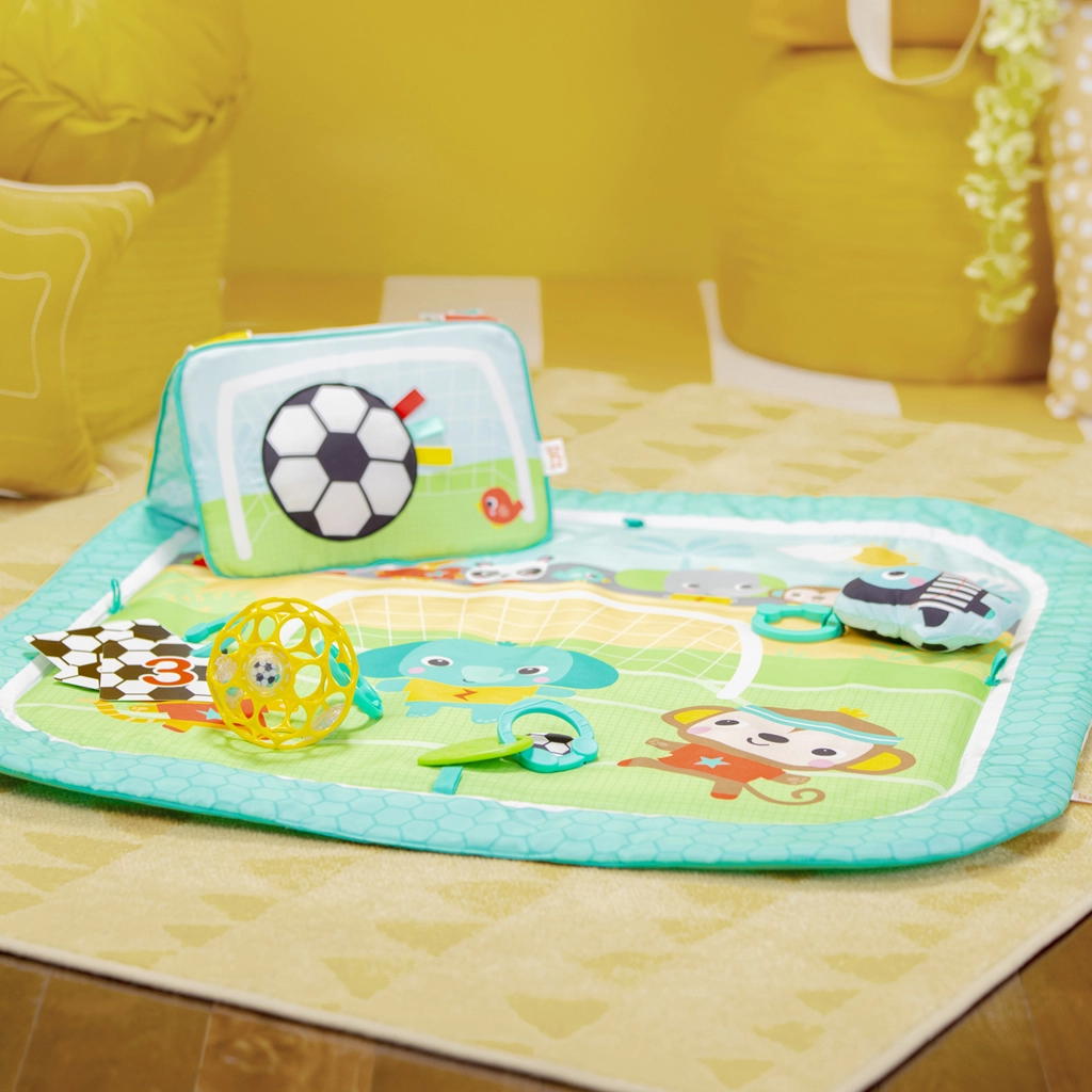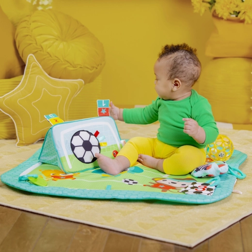 Pripremite se za zabavu od prvih dana s igralištem BRIGHT STARTS Oball Grip & Kick. Nudi 4 načina igre – na trbuščiću, ležeći, sjedeći i u pokretu – te interaktivnu podlogu sa svjetlima, melodijama i zvukovima (30+), koji nagrađuju svaki dodir i udarac. Mekana, podstavljena površina i raznolike viseće igračke potiču senzorni razvoj te finu i grubu motoriku.