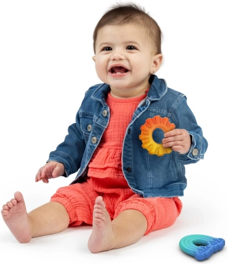 Preslatka grickalica u obliku sunca i duge donosi bebama udobnost pri nicanju prvih zubića. Mekani, ali izdržljiv silikon nudi različite teksture – od blagih izbočina do rebraste površine – koje učinkovito masiraju bolne desni i istovremeno potiču osjetila djeteta.