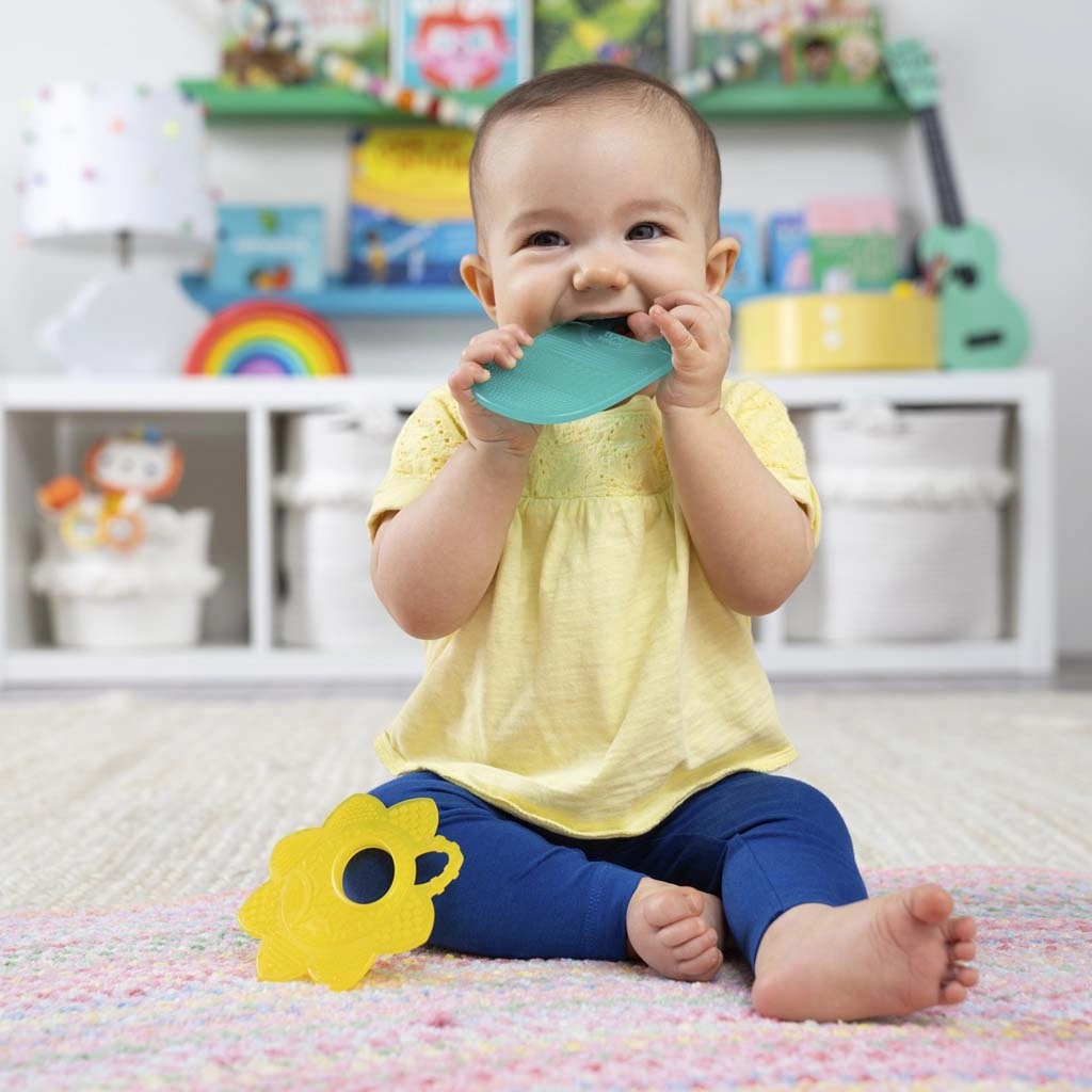 Grizalice Bright Starts Sunny Soothers u obliku cvijeta i “vesla” dizajnirane su za udobno držanje malim ručicama i ciljanu olakšicu pri nicanju zubića. Različite teksture i vlakna/četkice nježno masiraju desni i pomažu umiriti bebu tijekom zahtjevnog razdoblja.