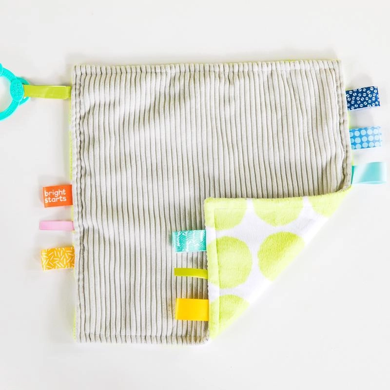 Mazilna dekica Bright Starts Little Taggies s motivom zelenih točkica mekani je pratitelj za bebe od rođenja. Zahvaljujući nježnim teksturama i laganoj izvedbi za lako držanje umiruje i potiče osjetilnu percepciju. Praktični C-prsten za pričvršćivanje na dječja kolica ili nosiljku osigurava da će omiljena tješilica uvijek biti pri ruci – kod kuće i na putu.