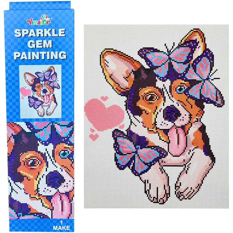 Ovaj set za dijamantno slikanje izvrsna je opcija za djecu od 6 godina koja vole stvarati. U pakiranju se nalaze šareni kamenčići, olovka za aplikaciju, voskasta olovka, posudica i platno s drvenim okvirom. Dovoljno je postupno skidati zaštitnu foliju i prema simbolima lijepiti kamenčiće – rezultat je efektna, blistava slika s psom.