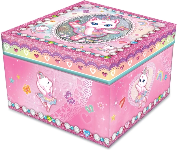 Stvorite čarobnu atmosferu u dječjoj sobi. Nakon podizanja poklopca, u odrazu zrcala počinje se okretati balerina–mačkica, a prostor ispunjava nježna glazba. Kutijica za nakit ima praktične pretince za sitna blaga i nakit, pa sve ostaje uredno posloženo.