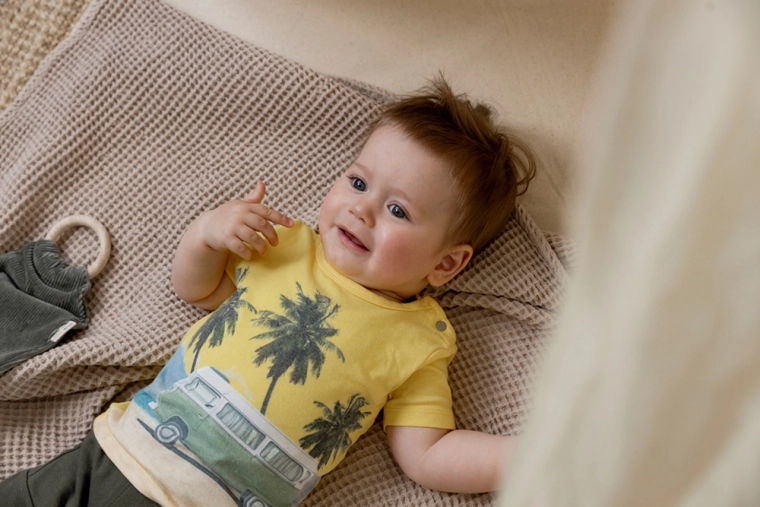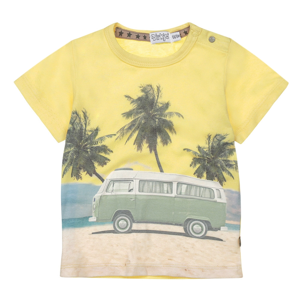 Uživajte u ljetu svaki dan s laganom i ugodnom majicom za male avanturiste. Žuta nijansa i razigrani plažni motiv daju outfitu svjež izgled, dok mekana pletenina s dodatkom elastana jamči slobodu kretanja i udobnost tijekom cijelog dana.