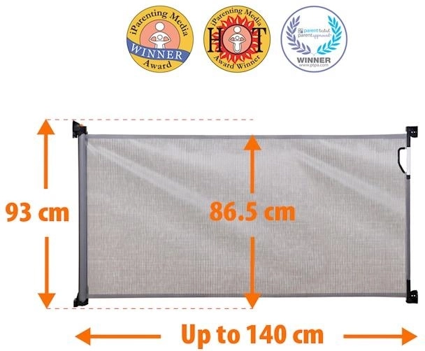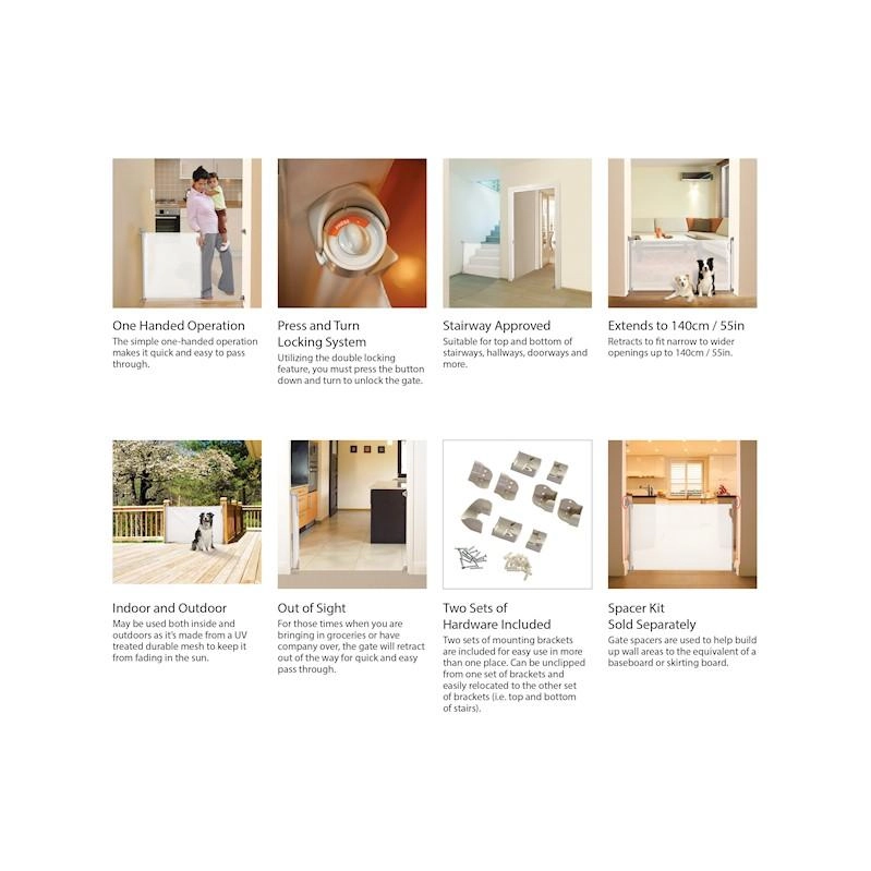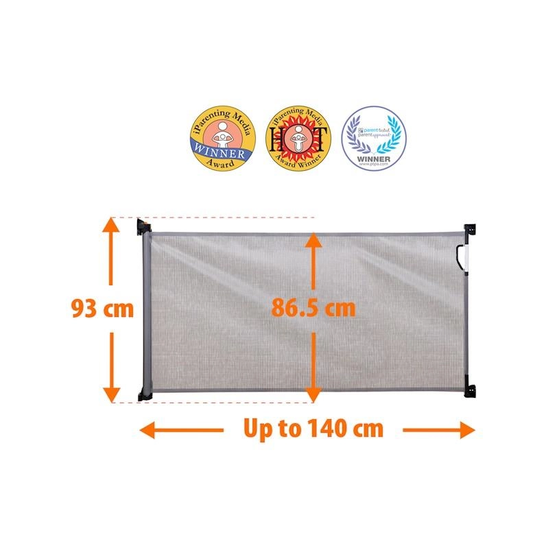 Sigurnost je na prvom mjestu: prozirna, ali izdržljiva mrežica pruža pouzdanu barijeru bez praga, stoga je izvrsna i za vrhove i podnožja stepeništa. Otvaranje i zaključavanje intuitivno je jednom rukom, a pregrada udovoljava strogoj normi EN 1930:2011 za zaštitu djece do 24 mjeseca.