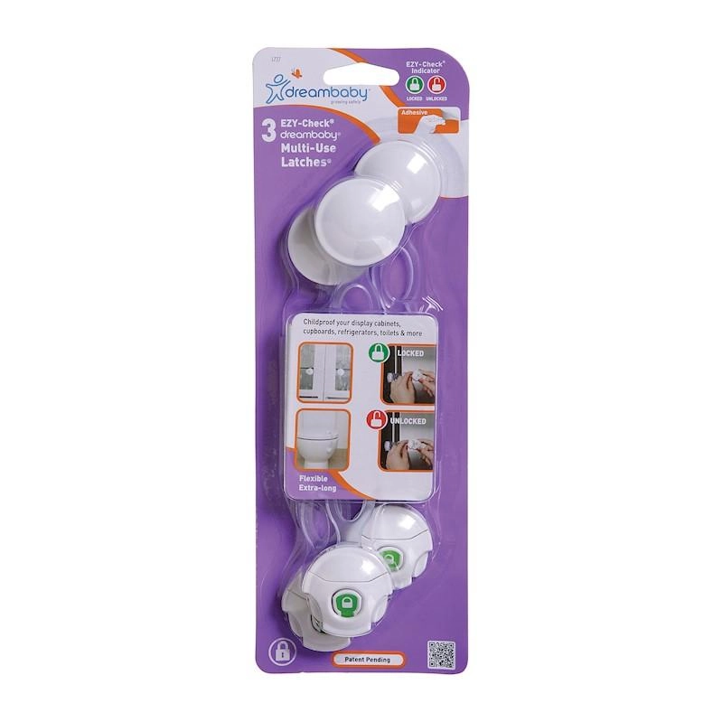 Višenamjenske brave DREAMBABY Ezy-Check učinkovito pomažu ograničiti djeci pristup opasnim mjestima u kućanstvu. Zahvaljujući pametnom indikatoru zaključavanja imate sigurnost na prvi pogled da je sve pouzdano osigurano. Ugradnja traje svega nekoliko minuta – dovoljno je zalijepiti, podesiti duljinu i učvrstiti.