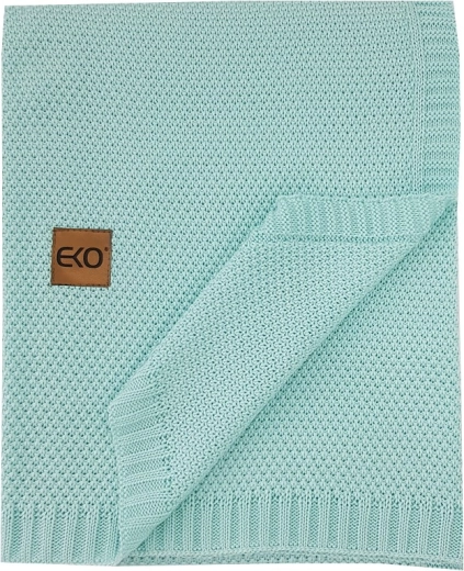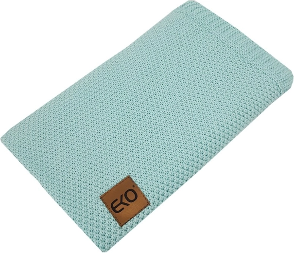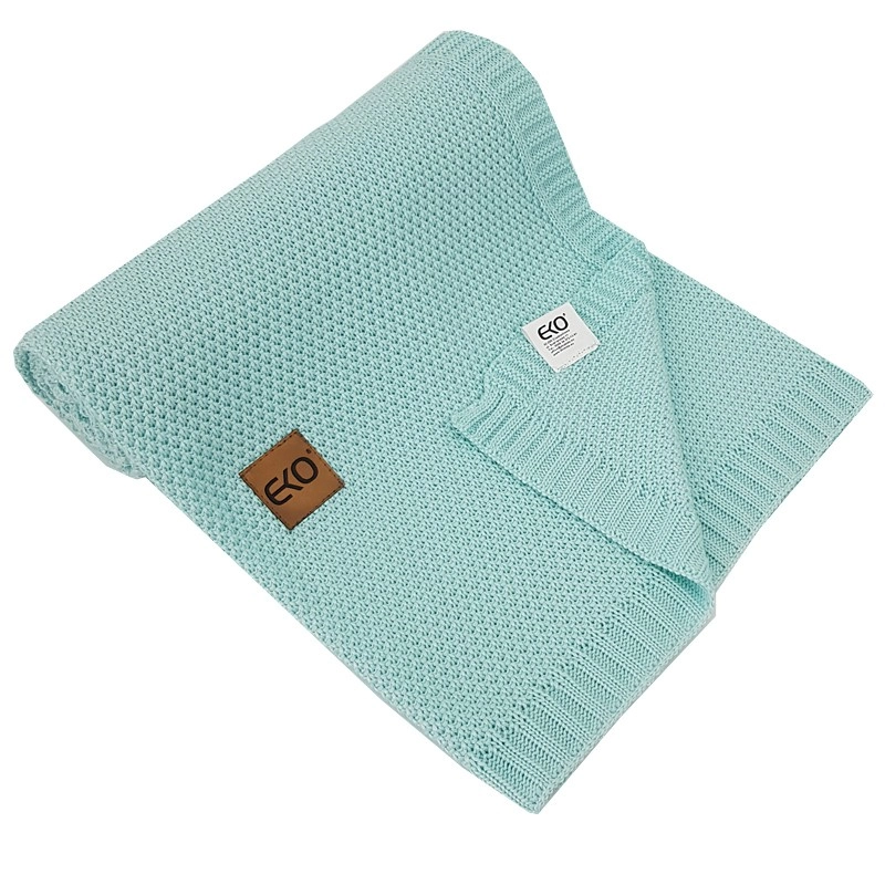 Moderan pleteni uzorak s diskretnom EKO etiketom i dimenzija 100 × 80 cm za kolica, krevetić i putovanja.