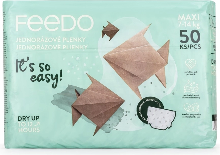 FEEDO jednokratne pelene Maxi kombiniraju visoku upojnost, prozračnost i siguran sastav bez parfema i lateksa. Troslojna jezgra brzo odvodi vlagu i održava kožu suhom, dok elastične manšete oko nogu i rastezljiv pojas osiguravaju sigurno, ali udobno pristajanje bez ograničenja pokreta.