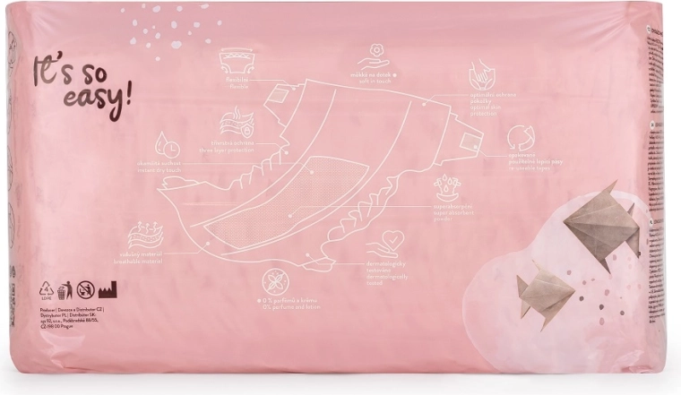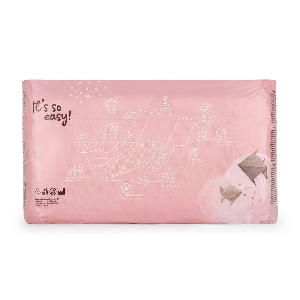 Zahvaljujući fleksibilnim gumicama oko nogu, rastezljivom pojasu i trakama za višekratno pričvršćivanje pelena se savršeno prilagođava obliku djeteta i ostaje udobna i pri aktivnom kretanju. Pelene su bez parfema i lateksa, dermatološki provjerene i prikladne za djevojčice i dječake.