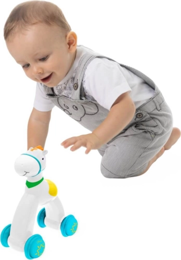 Zabavna pokretna igračka CHICCO za najmlađe koja zahvaljujući mehanizmu push and go razvija grubu motoriku, koordinaciju i prostornu percepciju. Dovoljno je pritisnuti tijelo konjića i pustiti – igračka kreće naprijed, čime potiče djecu na puženje i hodanje. Šareni dizajn, gumeni kotačići i zvečke u perlicama za još veću zabavu.