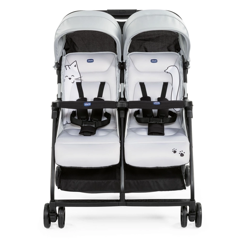 Ultra lagana i kompaktna kolica za blizance CHICCO Ohlala Twin u dizajnu Silver Cat nude udobnost od rođenja, sklapanje jednom rukom i neovisno podešavanje naslona sjedala. Zahvaljujući 5-točkovnim pojasevima, prostranoj košari i kabanici u pakiranju idealna su za svakodnevne šetnje i putovanja.