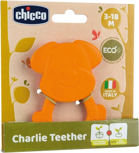 Grickalica Chicco Eco+ u obliku simpatičnog psića Charlieja dizajnirana je za potrebe djece od 3 mjeseca. Mekan, podatni materijal i promišljene izbočine pružaju ugodnu masažu desni i pomažu ublažiti nelagodu pri rastu zubića. Ergonomski oblik lako leži i u najmanjim ručicama.