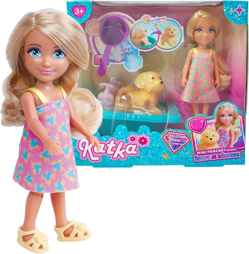 Set Lutka Katka sa psom i kadom razveselit će svaku malu njegovateljicu. Lutka ima dugu kosu pogodnu za češljanje i šarenu odjeću, pseći prijatelj potiče osmišljavanje priča, a kada u veselim bojama upotpunjuje rituale kupanja lutke. Zahvaljujući kvalitetnim materijalima, igra je sigurna i izdržljiva za svakodnevnu upotrebu.