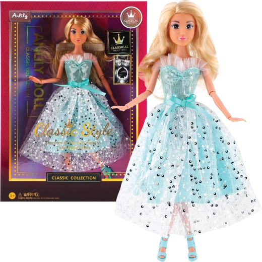 Otkrijte čaroliju mode s ovom elegantnom lutkom u dugoj svijetloplavoj svečanoj haljini. Zahvaljujući stilskom dizajnu i preciznim detaljima, postat će zvijezda svake dječje revije. Kvalitetni materijali osiguravaju sigurnu i ugodnu igru.