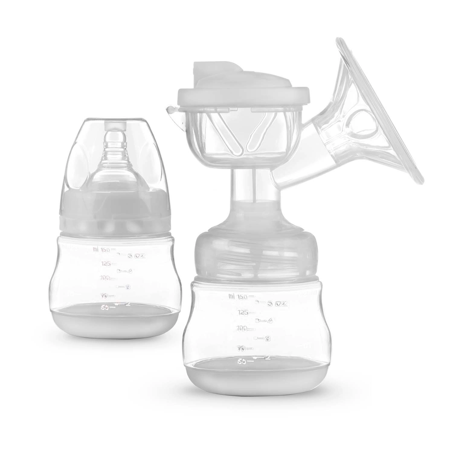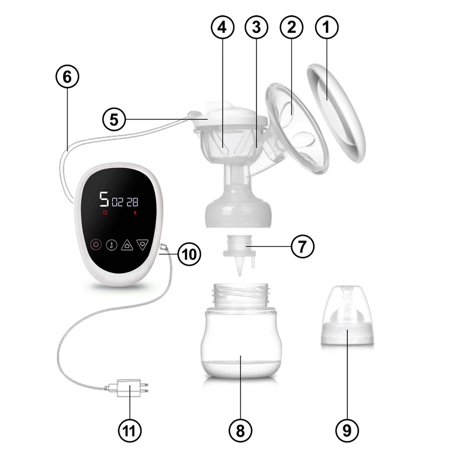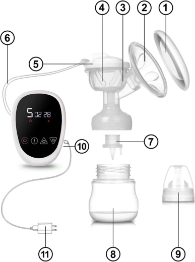 - Lijevak s masažnim umetkom, tijelo izdajalice, silikonska membrana i cjevčica, ventil, bočica 150 ml, duda s kapicom, upravljačka jedinica, mrežni adapter