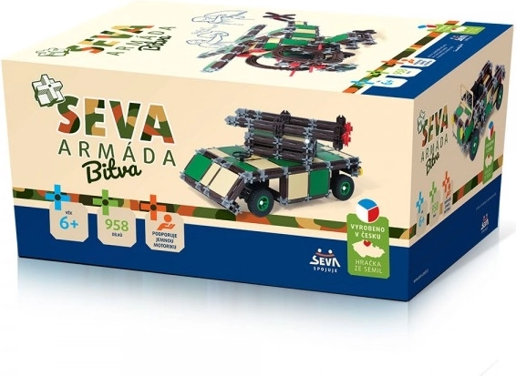 Konstruktor SEVA Vojska – bitka donosi djeci beskrajne mogućnosti stvaranja i igre. Zahvaljujući 958 pažljivo izrađenih dijelova mogu graditi realistična vojna vozila i maštovite konstrukcije. Češka kvaliteta, sigurni materijali bez ftalata i provjerena izrada jamče dug vijek trajanja i sigurnu igru.