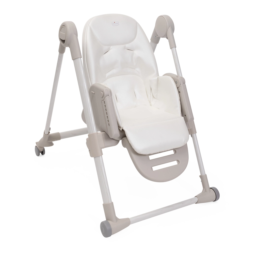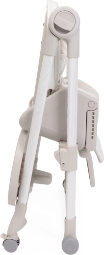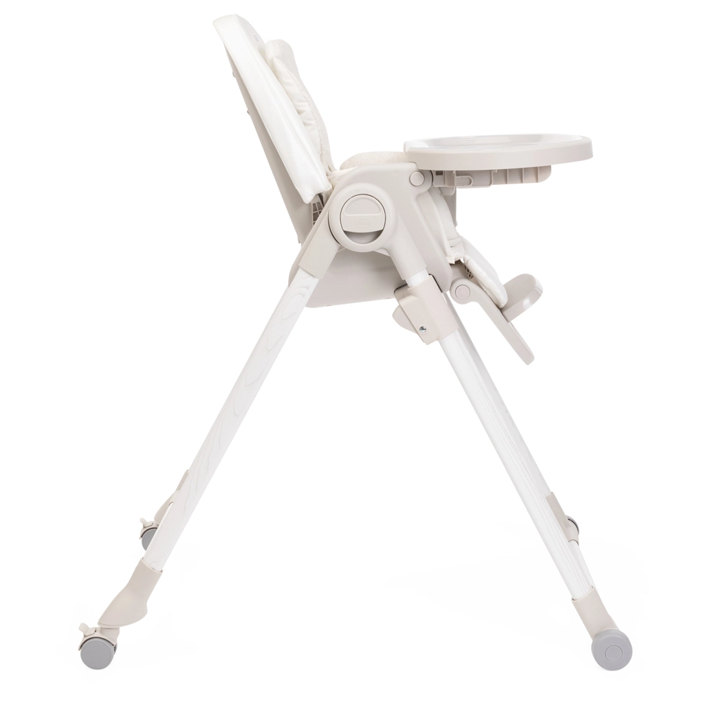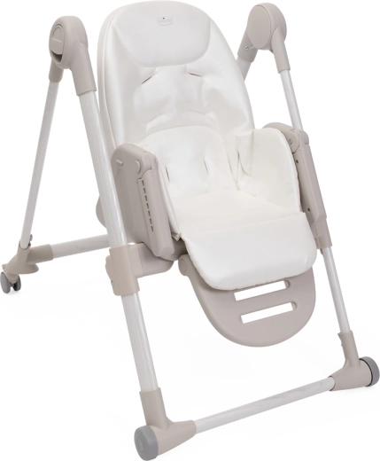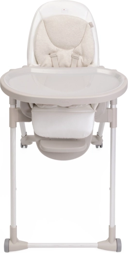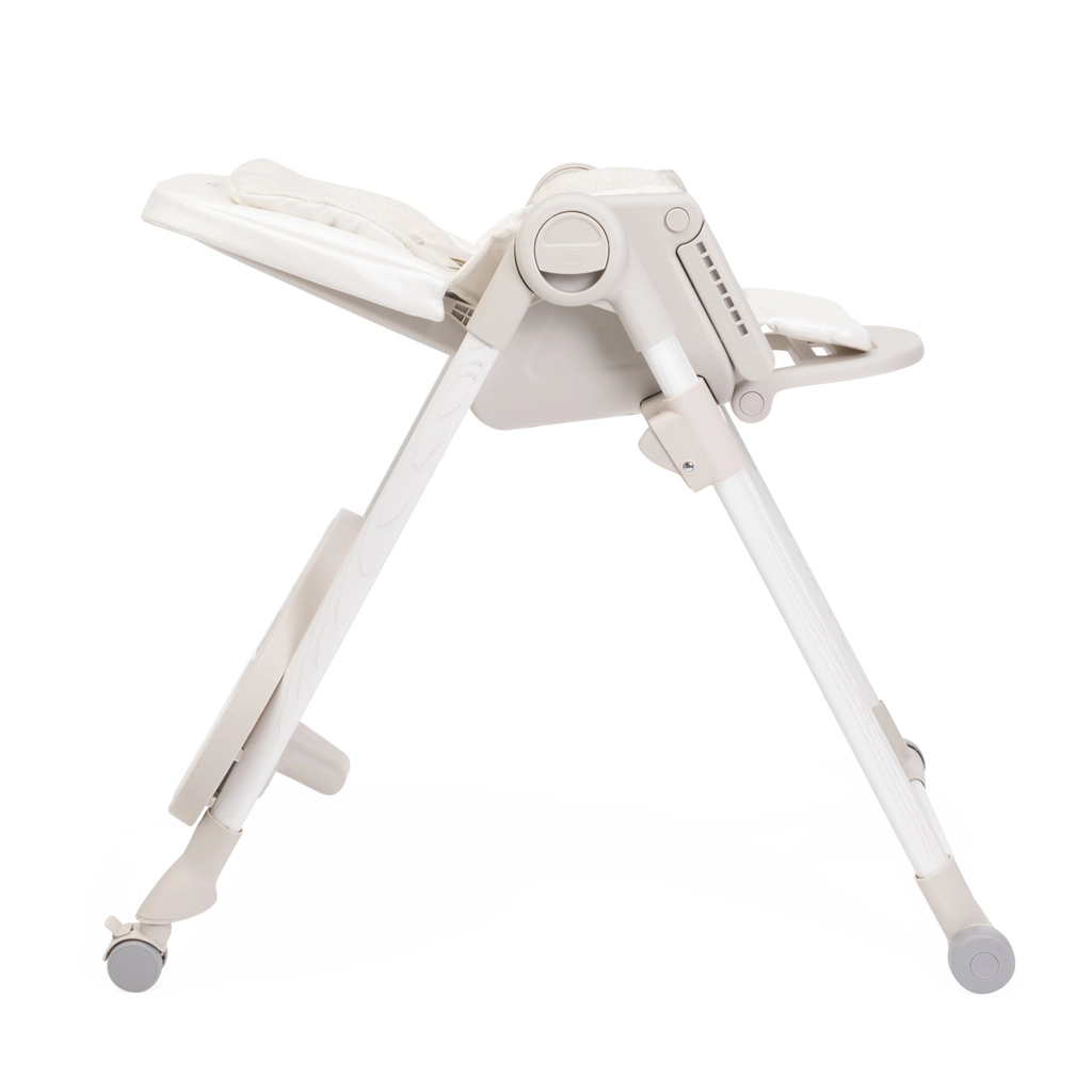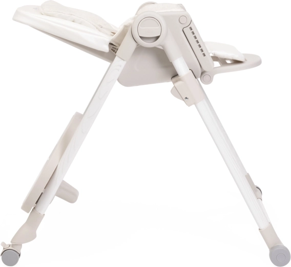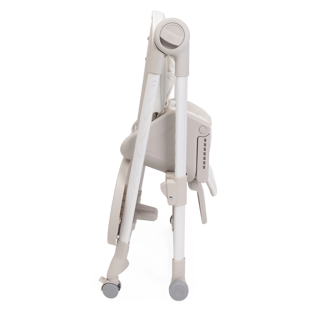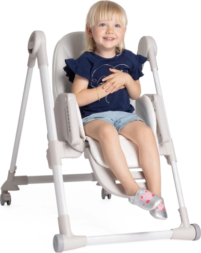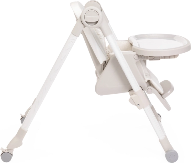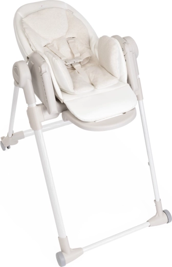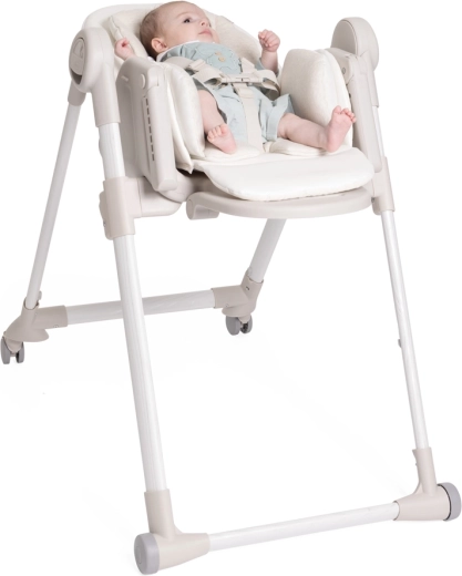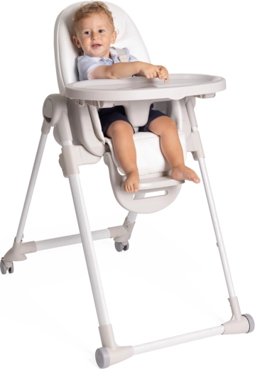 Praktične funkcije olakšavaju svakodnevicu: 9 visinskih razina za poravnanje s bilo kojim stolom, podešavanje naslona sve do potpuno ležećeg položaja za odmor bebe, podesivi oslonac za noge i odvojivi pladanj za lako posluživanje i približavanje stolu. Četiri kotačića omogućuju glatko premještanje po stanu, a kompaktno sklapanje sa samostalnim stajanjem štedi prostor. Navlaka od 100% recikliranih PET vlakana je vodoodbojna, ugodna na dodir i periva u perilici.