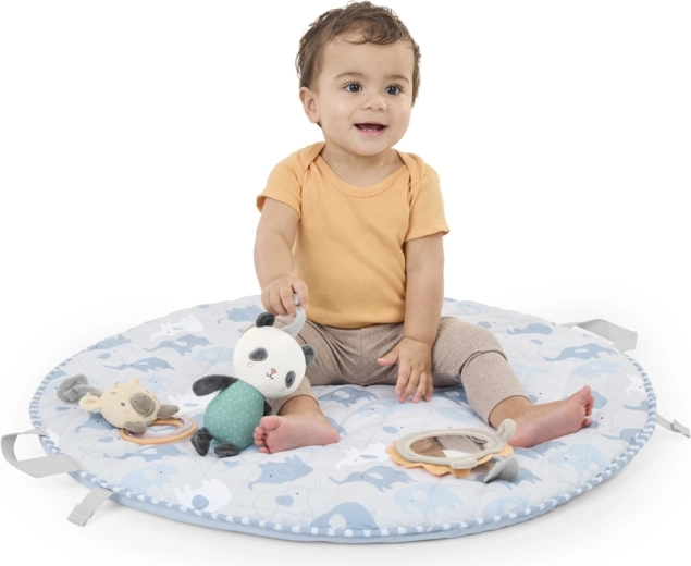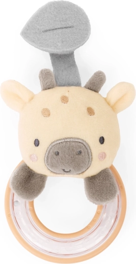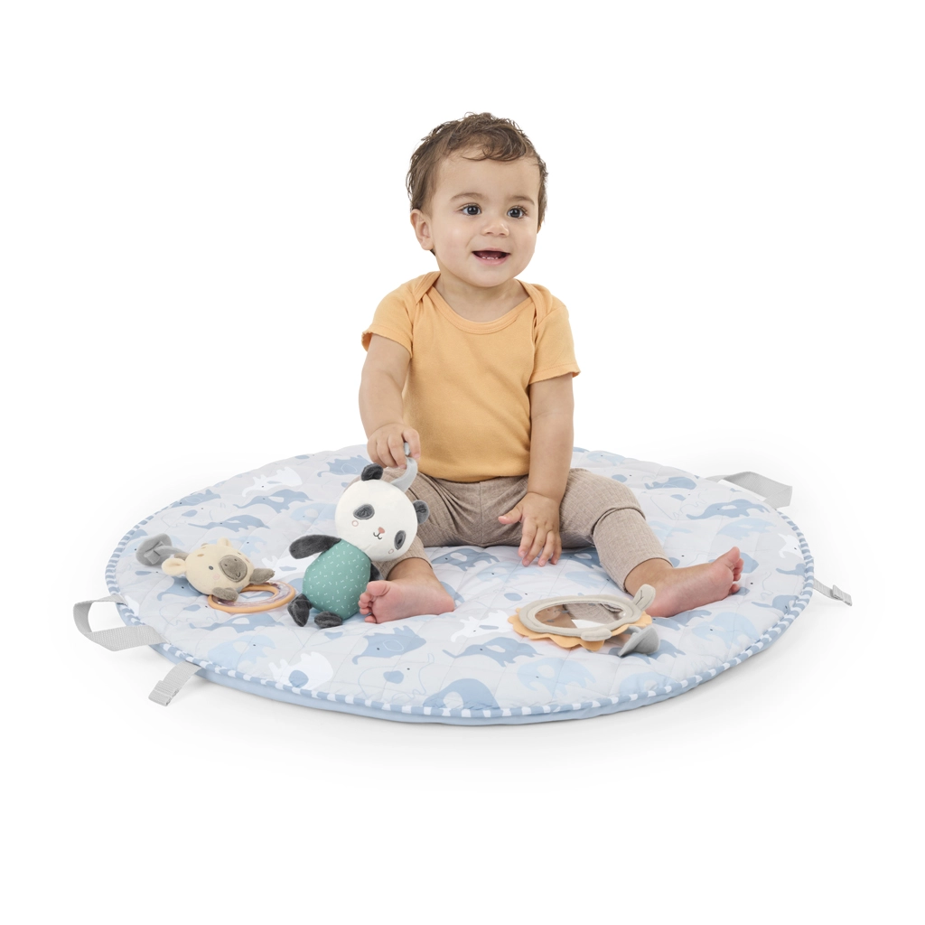 Silikonska grickalica u obliku lista, plišana panda, drveni prsten, sigurno zrcalce s lavićem i zvečkica sa žirafom potiču na hvatanje i istraživanje.