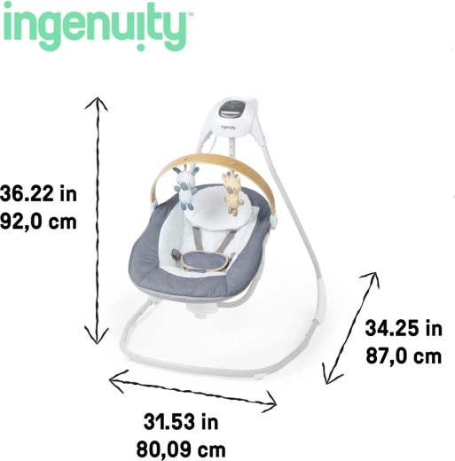 Ingenuity SimpleComfort Chambray je promišljena dječja ljuljačka koja spaja udobnost, sigurnost i zabavu u jednom. Okretno sjedalo od 180° omogućuje ljuljanje u tri smjera, pa lako prilagodite kretanje i smjer kontakta s roditeljem. Tehnologija TrueSpeed održava odabranu brzinu ljuljanja prema težini djeteta, a motor WhisperQuiet osigurava maksimalno tih rad.