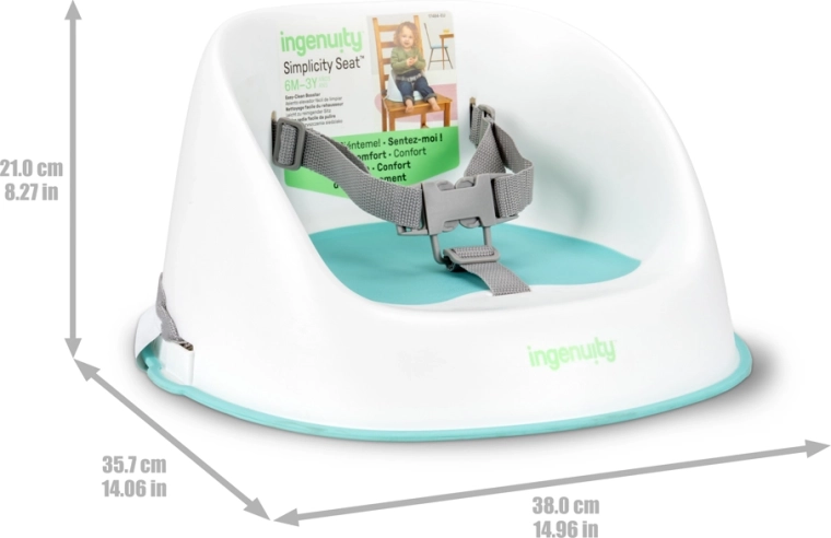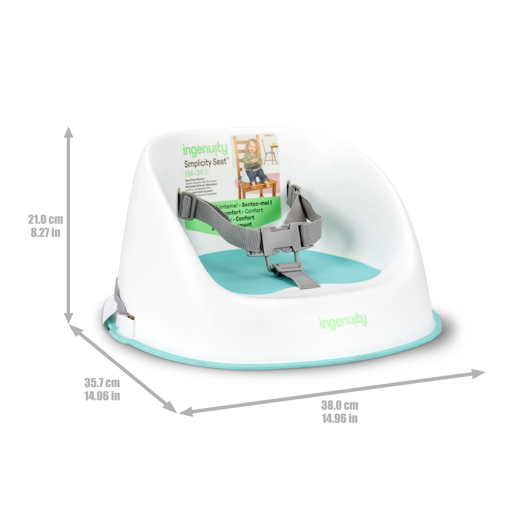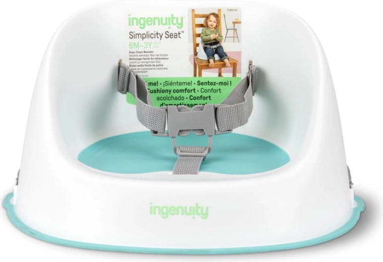 Podizač Ingenuity Simplicity Seat pomaže djeci glatko prijeći s visoke hranilice za bebe za zajednički stol. Lagani i kompaktni dizajn bez potrebe za montažom dovoljno je raspakirati, pričvrstiti i odmah koristiti. Meke kontaktne površine osiguravaju udobnost, dok izdrživa, površina koja se briše i perivi remeni podnose svakodnevni nered.