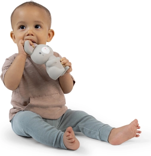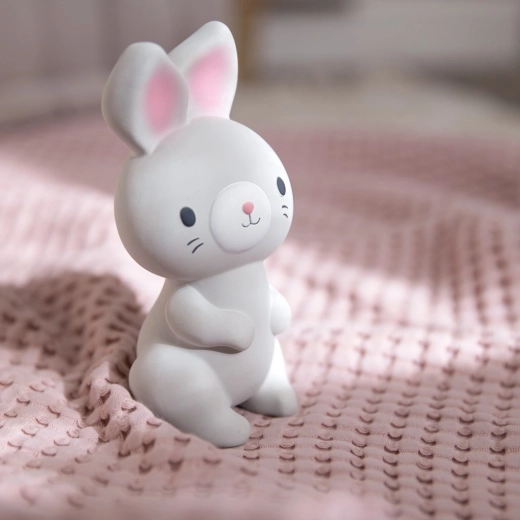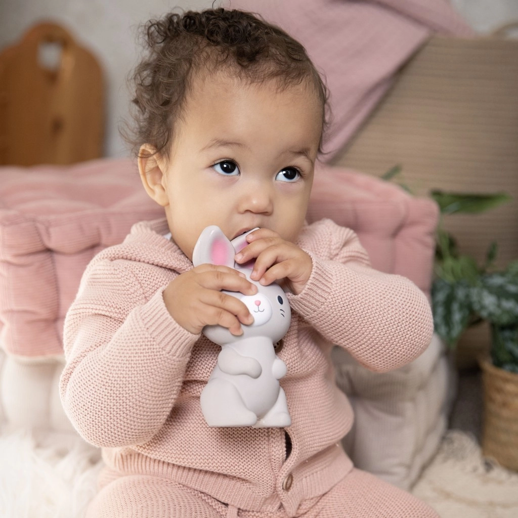 Slatka gricka u obliku zečića od prirodne gume nježno olakšava nicanje zubića i istodobno stimulira osjetila zahvaljujući pištanju, teksturama i obliku koji je lako uhvatiti. Ergonomičan dizajn za najmanje od 0 mjeseci, sigurne neutralne boje i mek, podatni materijal za ugodno stiskanje i grickanje.