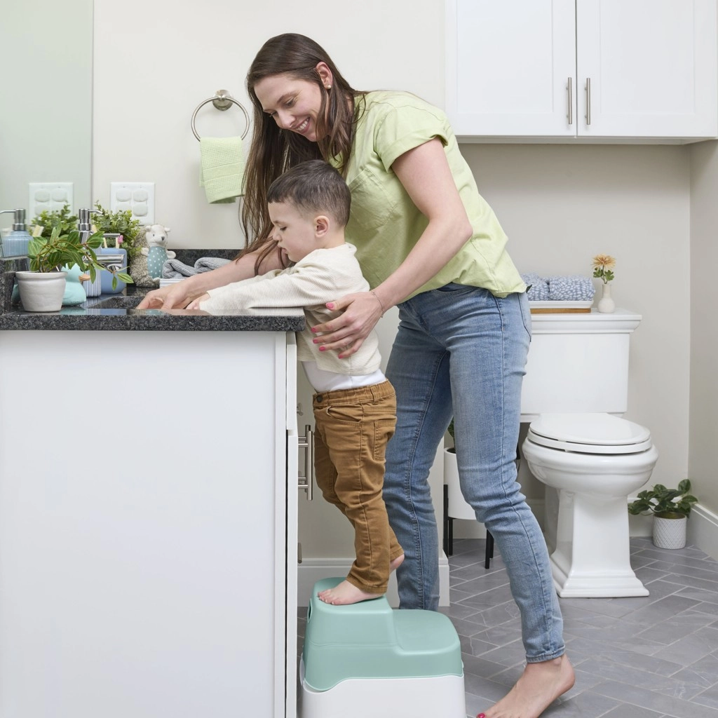 Stabilna dvorazinska stolić-stepenica s protukliznom površinom pomaže djeci sigurno dosegnuti WC i umivaonik.