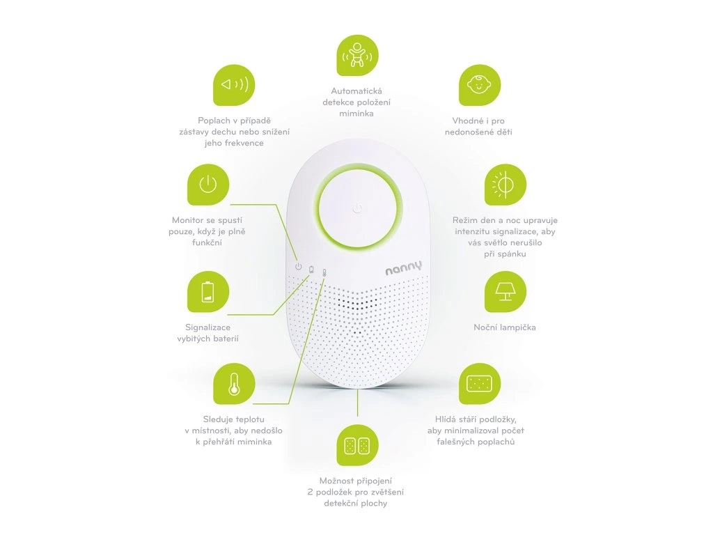Zahvaljujući jedinstvenoj detekciji položaja bebe Nanny će vas upozoriti ako je beba na podlozi, a monitor nije uključen. Pametni autotest pri uključivanju dodatno provjerava stanje uređaja i životni vijek senzorske podloge. Za udobno noćno korištenje tu je integrirana lampica s automatskim prigušenjem indikatora i nadzor temperature u prostoriji, što pomaže spriječiti pregrijavanje – jedan od rizičnih čimbenika SIDS-a.