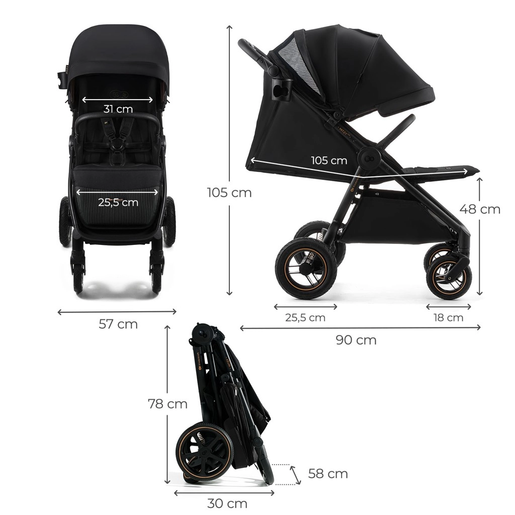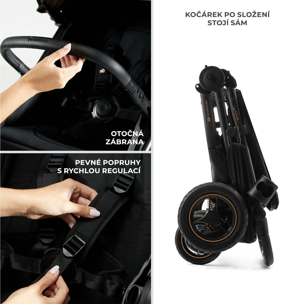 Mitzy Air idealan je izbor za aktivne obitelji koje traže udobnost, sigurnost i stil u jednom. Zahvaljujući pneumatskim kotačima i učinkovitom ovjesu savladava rubnike, kaldrmu i šljunak. Velika, vodootporna krošnja s UPF50+ štiti od sunca i kiše, a zahvaljujući ventilacijskom panelu i prozorčiću osigurava stalan kontakt i protok zraka.