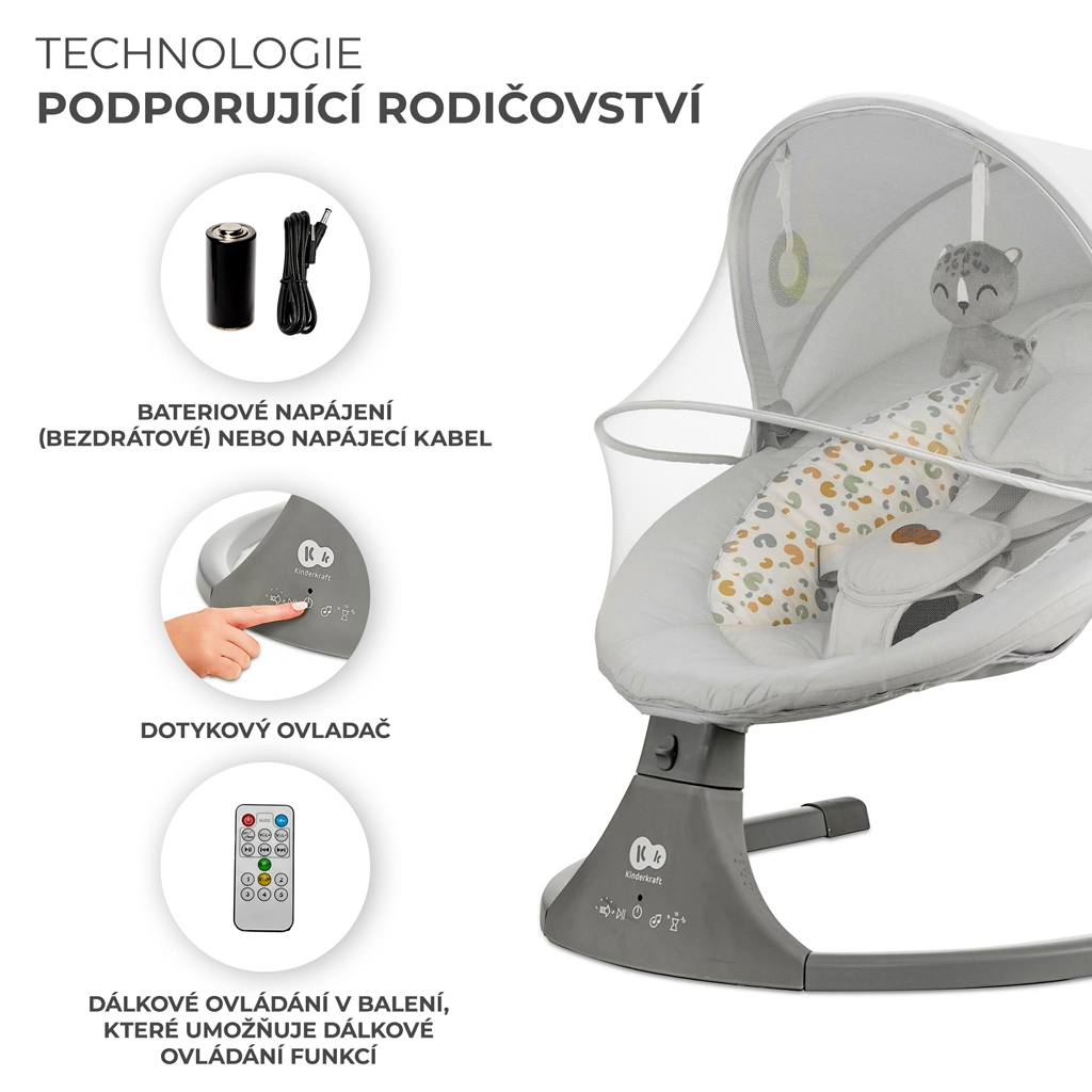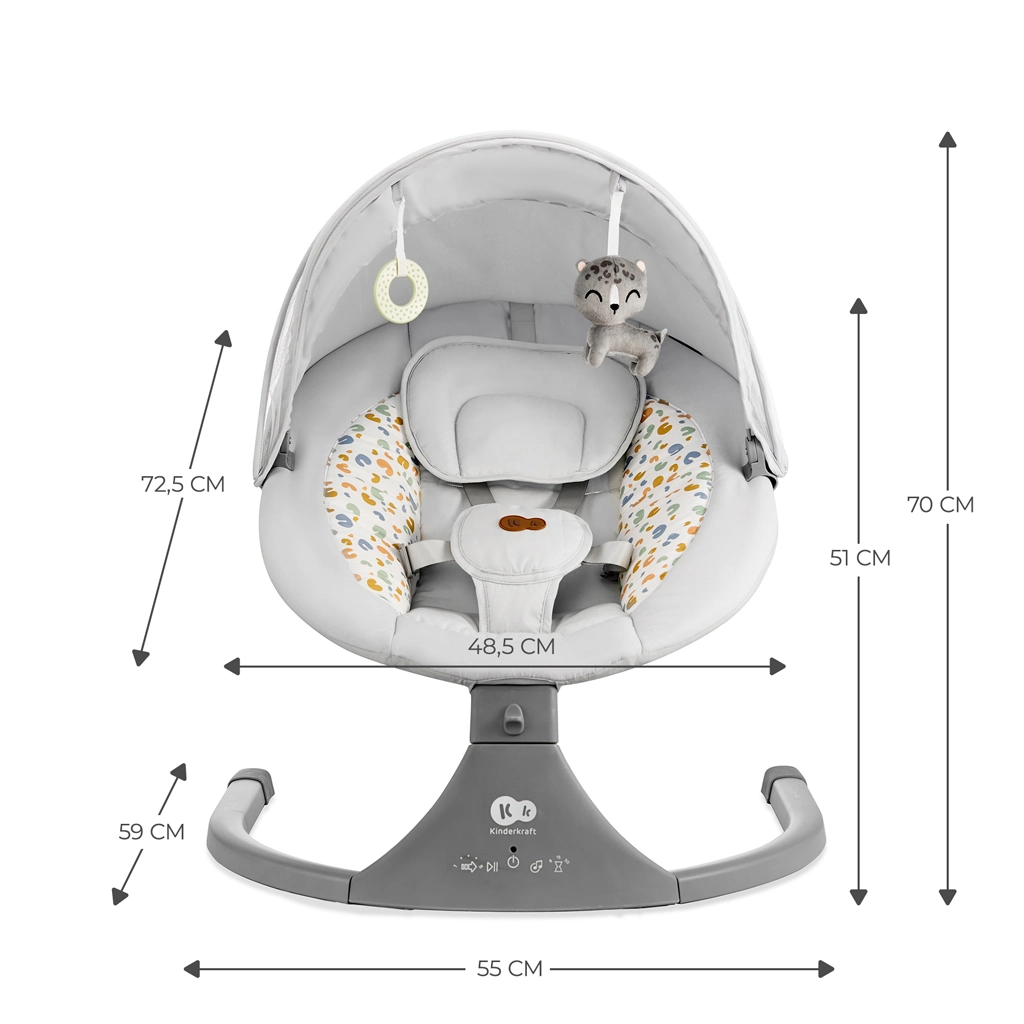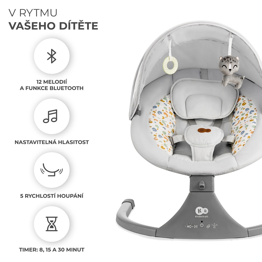 Ležaljka Kinderkraft LUMI spaja modernu tehnologiju i siguran dizajn za udobno uspavljivanje od rođenja do 9 kg. Zahvaljujući bočnom ljuljanju beba se osjeća kao u naručju, dok tihi motor ne remeti san. Uz mobilnu povezivost Bluetooth i USB ulaz lako puštate omiljene uspavanke izravno s telefona.
