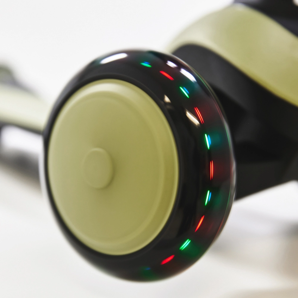 Veliki prednji PU kotači s LED osvjetljenjem zasvijetle tijekom vožnje. Povećavaju vidljivost u sumrak i daju efektan izgled bez baterija.