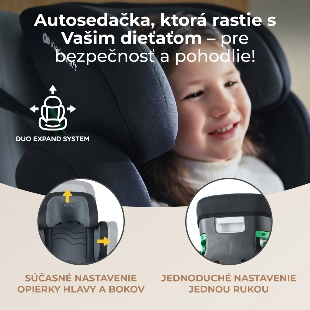 Kinderkraft XPAND 2 i-Size donosi višu razinu sigurnosti i udobnosti za svakodnevna putovanja djece od 100 do 150 cm. Konstrukcija odgovara najnovijem standardu R129/03 i-Size i prošla je testiranja u renomiranim europskim laboratorijima. Zahvaljujući ISOFIX konektorima i jasnom vođenju pojasa sa zelenim indikatorom ugradnja je brza i intuitivna.