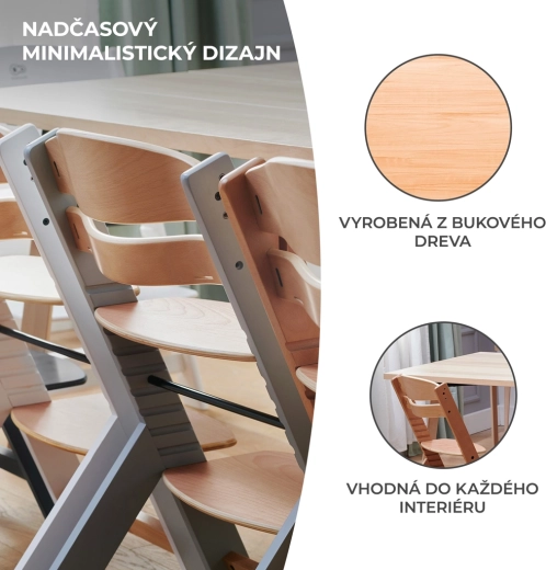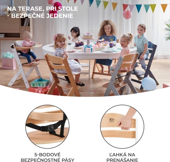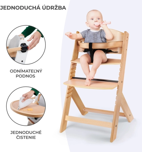 Za najmlađe je tu široka odvojiva tacna i trobodni sigurnosni pojas, a za stariju djecu zaštitna prečka. Stolica se lako čisti, a njezina lagana konstrukcija omogućuje jednostavno premještanje između kuhinje, blagovaonice i terase. Minimalistički dizajn odlično se uklapa u skandinavske, klasične i moderne interijere.