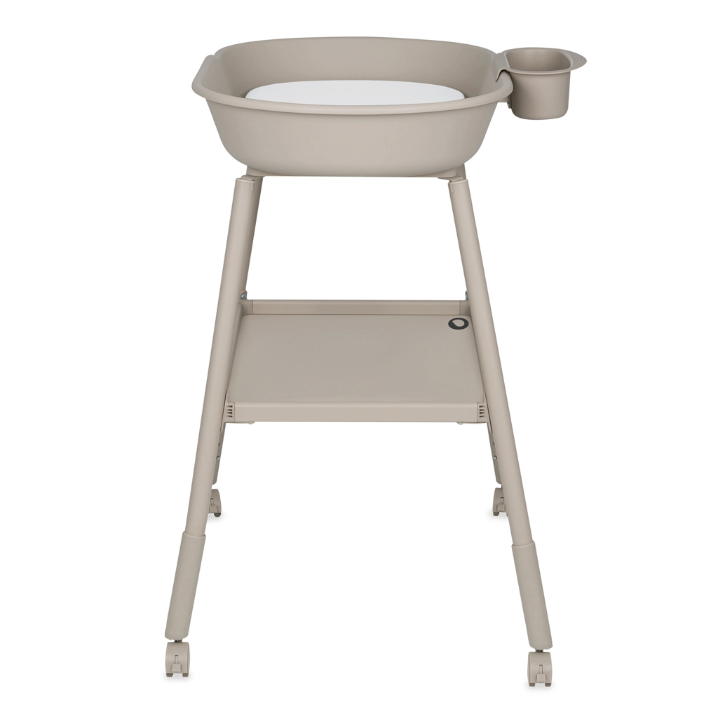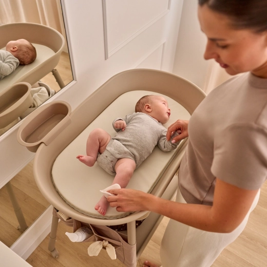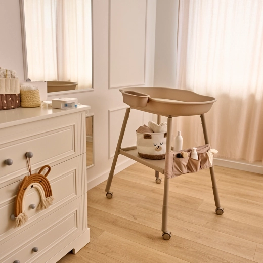 Organizacija je jednostavna: tekstilni organizator s 5 džepova, prostrana donja polica i odvojiva bočna posuda drže sve potrepštine nadohvat ruke. Četiri kotača s kočnicama omogućuju beznaporno premještanje stolića tamo gdje vam je trenutačno potreban – iz kupaonice u dječju sobu i natrag.