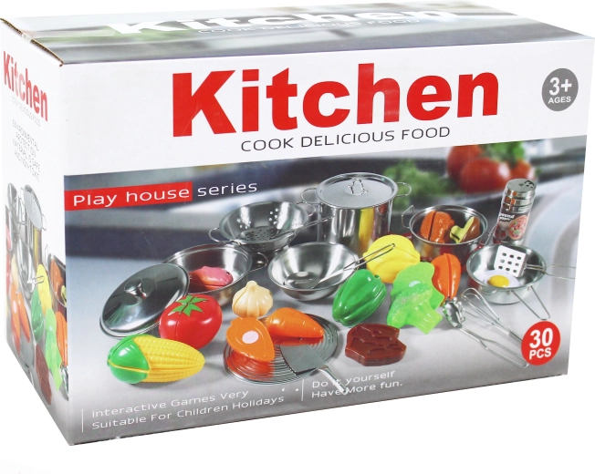 U pakiranju se nalazi 30 kvalitetnih komada – razne lonci, tave i kuhinjski pribor – osmišljeni tako da odgovaraju stvarnom posuđu. Set je idealan za zajedničku igru braće i prijatelja te se savršeno uklapa u dječju sobu.